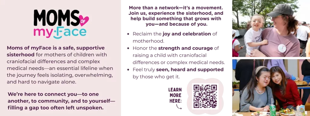 Moms of myFace is a safe, supportive sisterhood for mothers of children with craniofacial differences and complex medical needs—an essential lifeline when the journey feels isolating, overwhelming, and hard to navigate alone.